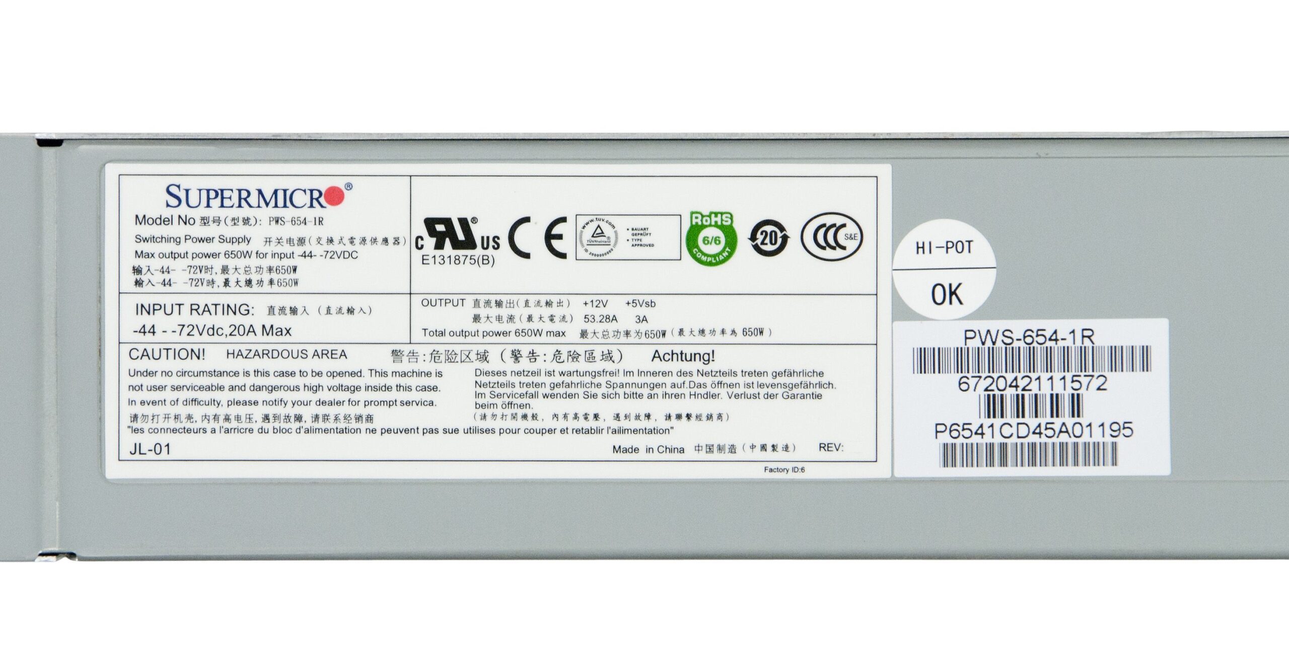 The Supermicro PWS-654-1R is a DC input power supply capable of supplying 650W output power at 90% efficiency. The PWS-654-1R is compatible with PWS-706P-1R, PWS-504P-1R, and PWS-704P-1R. Enjoy the simplicity of active power factor correction (PFC) and automatically correct DC input for a full range of voltages. Features a card edge connector for connection with the backplane of compatible Supermicro 1U systems. This power supply is designed to not only provide you reliable power to your Supermicro server but also protects it from over voltage, over current and short circuiting via protective circuitry embedded into the unit. Rest easy knowing your hardware will be up and running with a mean-time between failure (MTBF) of greater than 200,000 hours and an LED indicator to keep you informed on normal/abnormal conditions for your PSU. This power supply is redundant to safe-guard your system from power failure and allows for hot-swap replacement to eliminate system downtime. All materials contained comply with RoHS requirements and is certified by Supermicro.