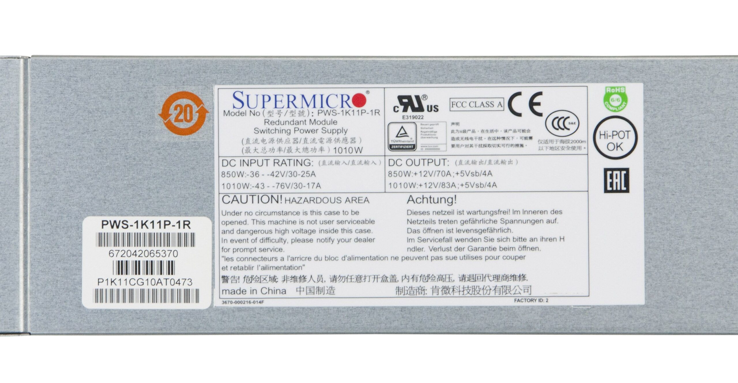 he Supermicro PWS-1K11P-1R is capable of supplying 850W low-line and 1010W high-line output power at 90% efficiency. Enjoy the simplicity of active power factor correction (PFC) and automatically correct DC input for a full range of voltages. Features a card edge connector for connection with the backplane of compatible Supermicro 1U systems. This power supply is designed to not only provide you reliable power to your Supermicro server but also protects it from over voltage, over current and short circuiting via protective circuitry embedded into the unit. Rest easy knowing your hardware will be up and running with a mean-time between failure (MTBF) of greater than 100,000 hours and an LED indicator to keep you informed on normal/abnormal conditions for your PSU. This power supply is redundant to safe-guard your system from power failure and allows for hot-swap replacement to eliminate system downtime. All materials contained comply with RoHS requirements and is certified by Supermicro.