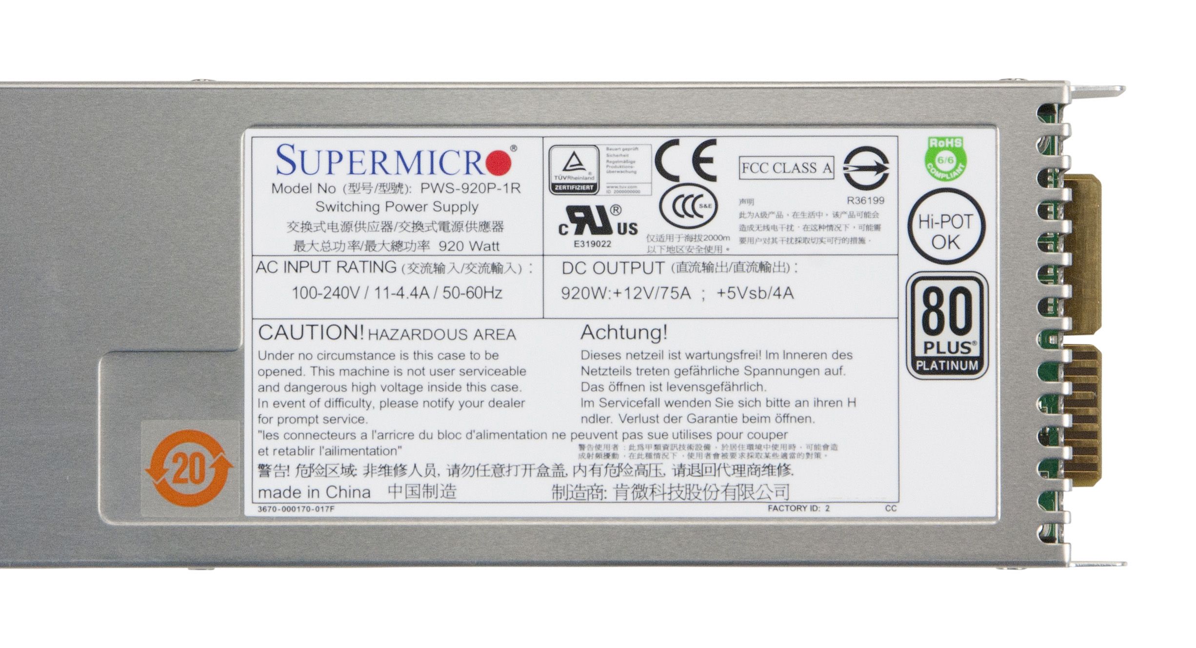 The Supermicro PWS-920P-1R is an 80 Plus Platinum level redundant power supply capable of supplying 920W output power at 91% efficiency. Enjoy the simplicity of active power factor correction (PFC) and automatically correct AC input for a full range of voltages. Features a card edge connector for connection with the backplane of compatible Supermicro 1U systems. This power supply is designed to not only provide you reliable power to your Supermicro server but also protects it from over voltage, over current and short circuiting via protective circuitry embedded into the unit. Rest easy knowing your hardware will be up and running with a mean-time between failure (MTBF) of greater than 150,000 hours and an LED indicator to keep you informed on normal/abnormal conditions for your PSU. This power supply is redundant to safe-guard your system from power failure and allows for hot-swap replacement to eliminate system downtime. All materials contained comply with RoHS requirements and is certified by Supermicro.